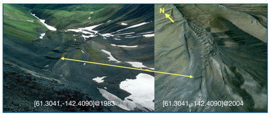 These images are typical of debris on visible, active glaciers and can be compared with the RG shown in Figure 4. This is the National Creek RG, with its complex active snout at [61.4868,-142.8693]; it is described as “rock glacier 2” with maps and images in the work of Capps [74], as can be seen in Figure 3 from his fieldwork in 1909. The images in Figure 4 are from 1987. It is easy to see why Capps called such features rock glaciers, with the following being stated:
