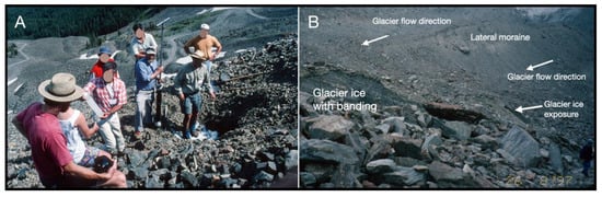 Glacier ice exposures from classic RG sites. (A) Ice core extracted by Noel Potter and held by Nel Caine at [44.6440,-109.7926] on Chapman Field Excursion, 1986 ([82], Figure 3). Potter [52] originally described this site with further references at RG[44.642,-109.791] {[35,51,65,66]}. (B) Glacier ice with debris banding on Gruben RG[46.1718,7.9624] below a relatively thin debris cover. A full explanation is given by Whalley [83]. Images © W. Brian Whalley.