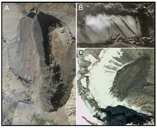 (A) Mt Timpanogos, Utah RG[40.3922,-111.6405] with copious talus development in the north-facing cliffs; however, with the glacier ice being covered by rockfall, the glacier has been preserved as an RG. The red circles in the upper portion show ice exposures as meltwater pools within the debris—also see Figure 10. (B) Glacier ice exposure in the core of the Arapaho Rock RG[40.0223,-105.6386] @1964 in [50], Figure 6—‘exposed 400 m down-valley from the base of the cirque head wall. Bands of dark-coloured ice, probably representing annual ablation surface, dip up-valley at angles of 40 to 45°; 21 August 1964′. Photo courtesy of © Sam Outcalt. (C) Debris rockslide onto the surface of a small glacier in the red circle is a boulder at [52.0822,-117.7856] @2011. Monitoring this small glacier with a portion being covered by the debris will be possible remotely using GE. Images A and C © Google Earth.