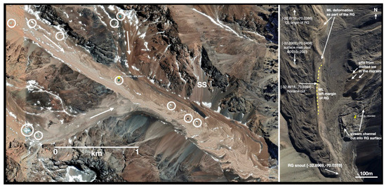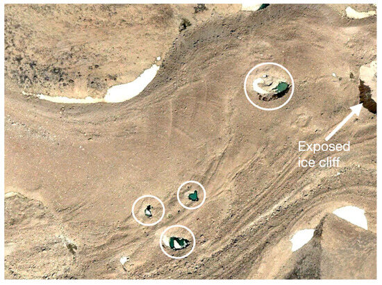 Meltwater ponds have recently been investigated on valley glaciers in many debris-covered glaciers in Asia [99] and in rock glacier–glaciers in the Hindu Kush [78]. The extensive rock glacier systems in the ‘Dry Andes’ have been used for hydrological [100] and permafrost mapping [101] purposes. An investigation with Google Earth shows that many of these systems, even small examples [102], have meltwater ponds. As well as single instances, these may be found in multiples along the lengths of RG. Examples are shown in Figure 11.
