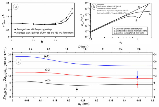 Results relevant to Kungl et al. (2020) [6] and Faran, 1951 [8] algorithm-based comparisons and interpretations of Frazer et al. (2020) [1] data. (a) Plots of F*avg/F vs. b for an exactly characterized frazil population with F*avg representing 2-frequency average F* estimates using data from 6 and 3 different pairs. (b) Normalized backscattering cross-sections vs. k1ae for elastic solid and liquid ice spheres in saltwater. A third curve depicts the Kungl et al. (2020) [6] relationship employed in Frazer et al. (2020) [1]. (c) Comparisons of ranges (vertical lines) and mean values (circular markers) of pairwise differences in measured logarithmic cross-sections during a 12:06 to 19:59 11 November 2017 interval are made relative to expectations based upon the Kungl et al. relationship (curve C in (b)). Curve labelling denotes specific frequency channel pairings (j,i) while curve colors facilitate evaluations of compatibility with corresponding measurement information. Curve variations are referenced to both effective radius, ae, and disk/spheroid diameter, D.