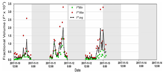 As expected from earlier algorithm verifications [7], similar testing of postnoon Frazer et al. (2020) [1] 2-frequency SV data against the alternative Faran (1951) [8] elastic sphere algorithm confirmed the feasibility of valid elastic solid ice sphere characterizations for each of the 6 possible acoustic frequency pairings. Consequently, fractional volume recalculations were carried out for three different (3,2), (4,2), and (4,3) pairings of 14.2 m SV(t) data constructed from measurements at 200, 455, and 769 kHz and additional 3-point mean data filtering. F*(t) values corresponding to averages over all three pairings are plotted at 33 min intervals along the solid line curve in Figure 3. Additional data markers, denoting maximum and minimum individual pair F*(t) estimates, are included to reflect estimate uncertainties. Limitations of manual calculations to three of the six available frequency pairs may have, according to the broken line, 3-frequency curve in Figure 2a, raised F*avg/F by an additional 10 to 15% for b values above 0.2. However, with allowances for systematic shape-related underestimates (Marko and Topham (2015) [7]), these results suggest that the F* estimates in Figure 3 are still representative of postnoon frazil content variations to within, roughly, a factor of two.