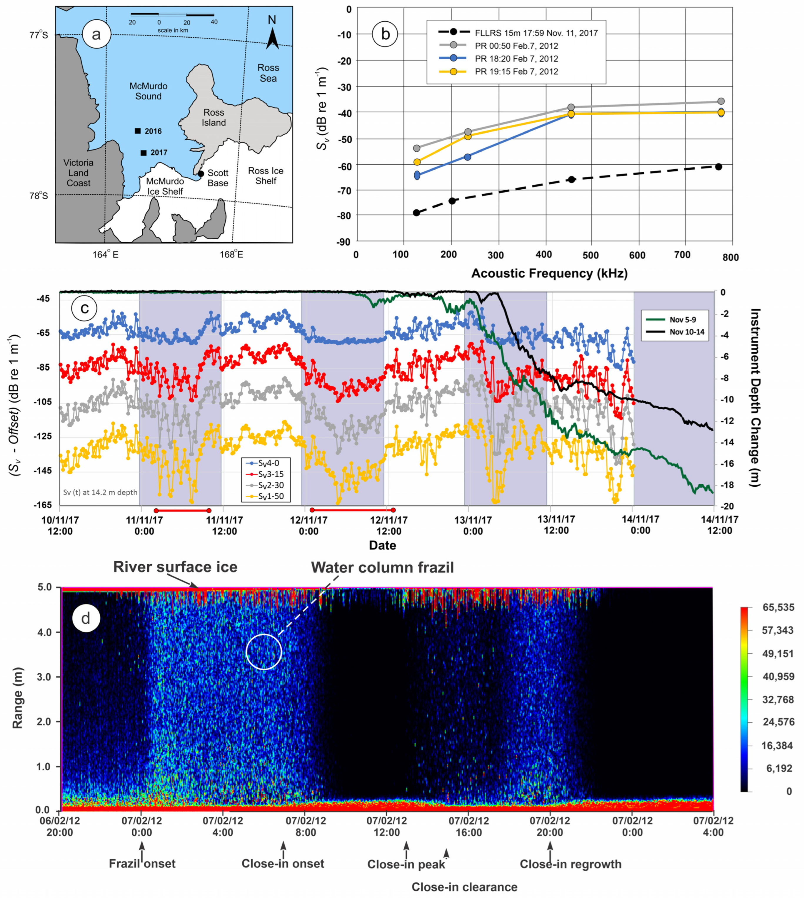 - Richard, M.; Morse, B.; Daly, S.F.; Emond, J. Quantifying suspended frazil ice using multi-frequency underwater acoustic devices. River Res. Appl. 2011, 27, 1106–1117. [Google Scholar] [CrossRef]