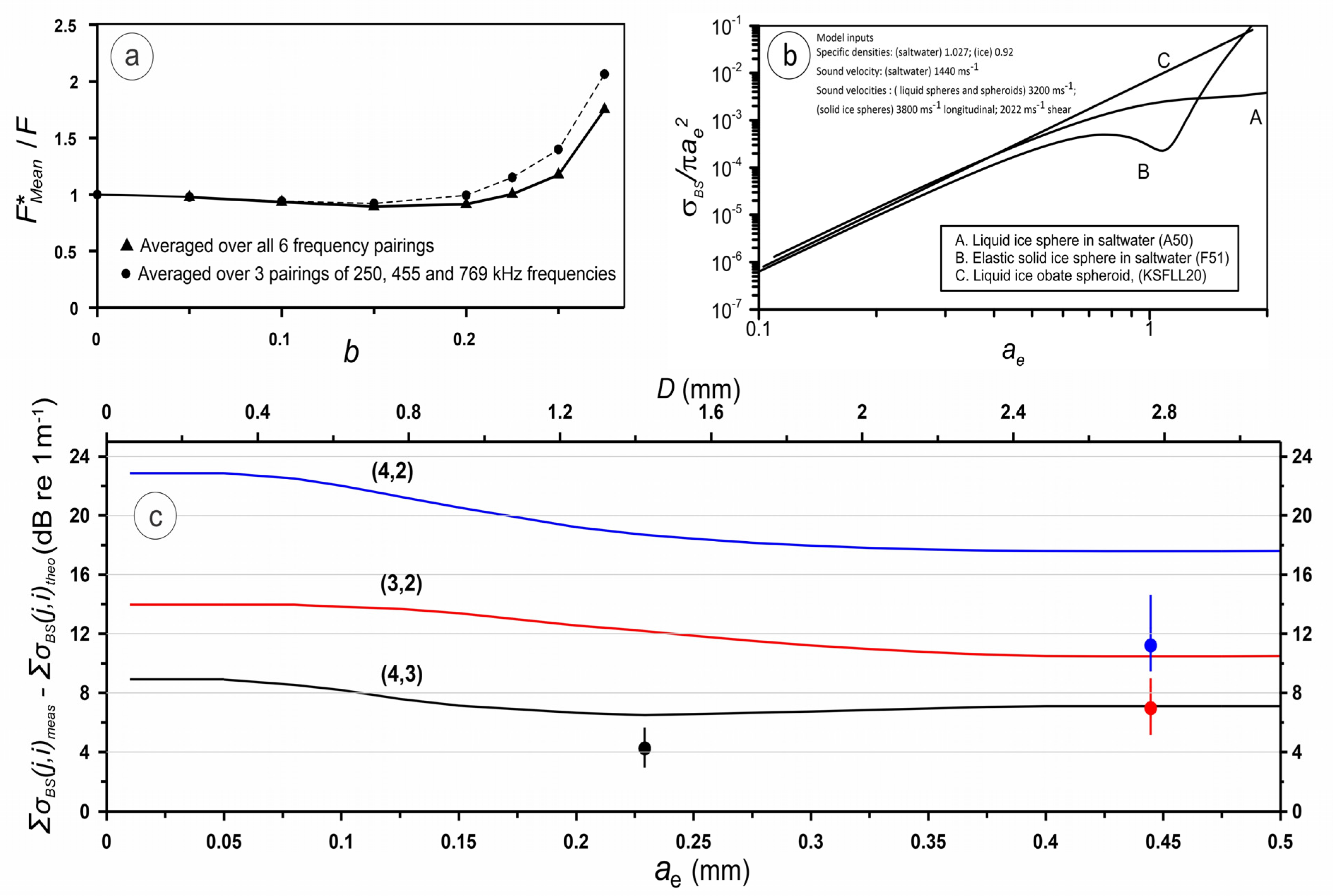 - Kungl, A.F.; Schumayer, D.; Frazer, E.K.; Langhorne, P.J.; Leonard, G.H. (An oblate spheroid model for multi-frequency acoustic back-scattering of frazil ice. Cold Reg. Sci. Technol. 2020, 177, 103122. [Google Scholar] [CrossRef]