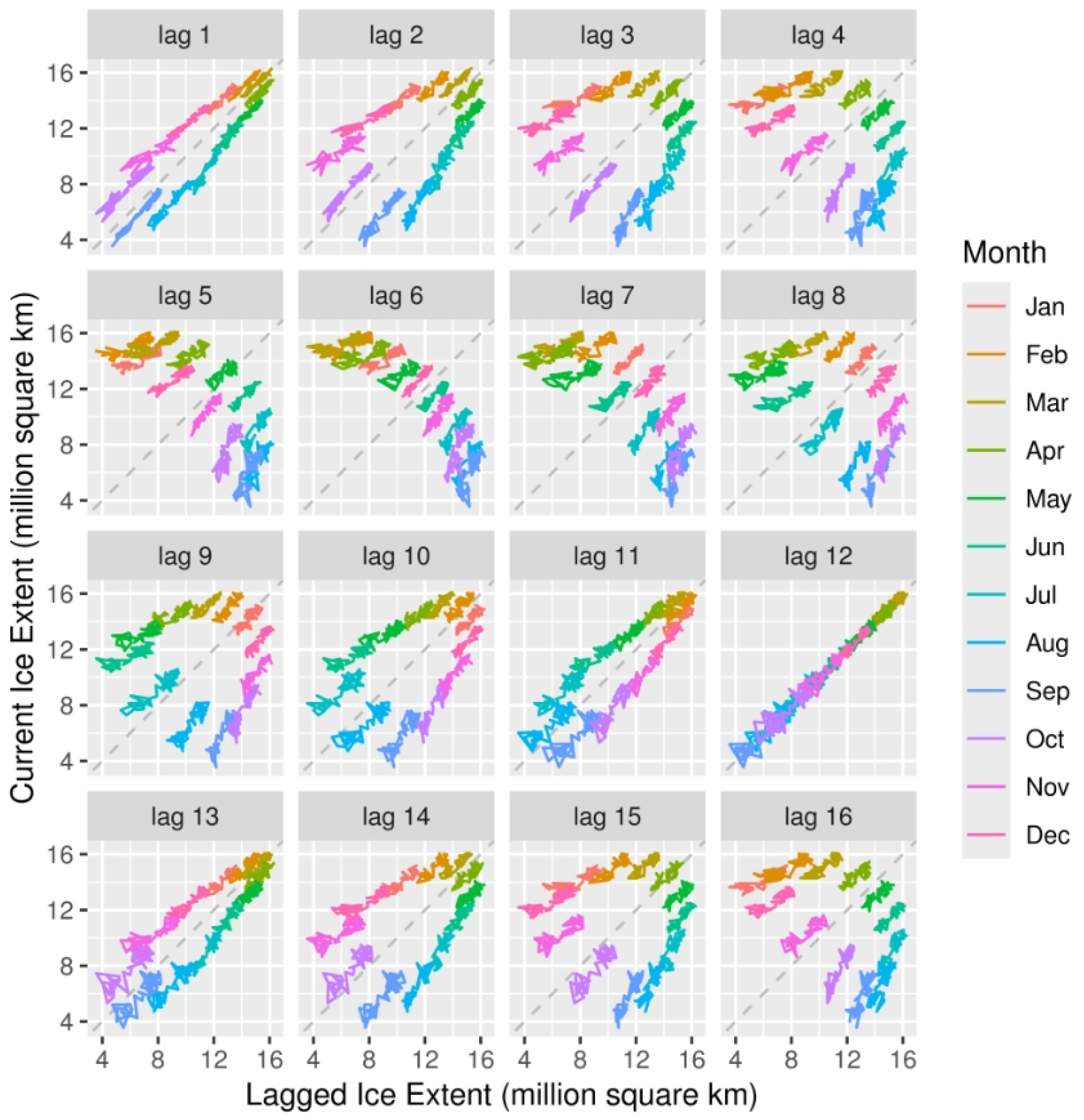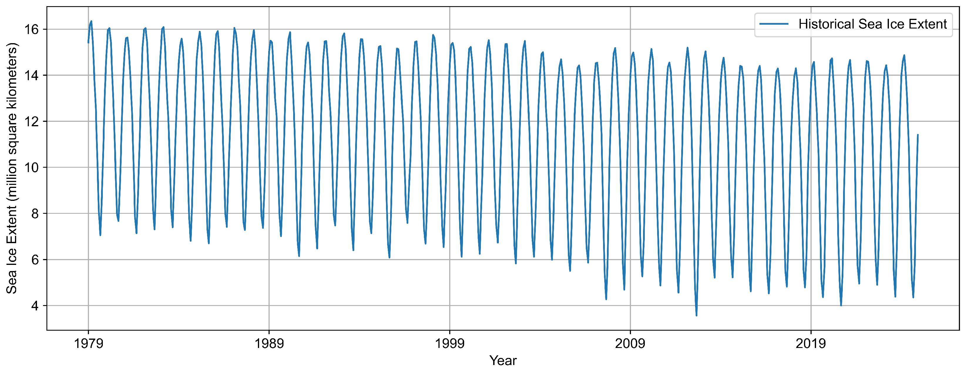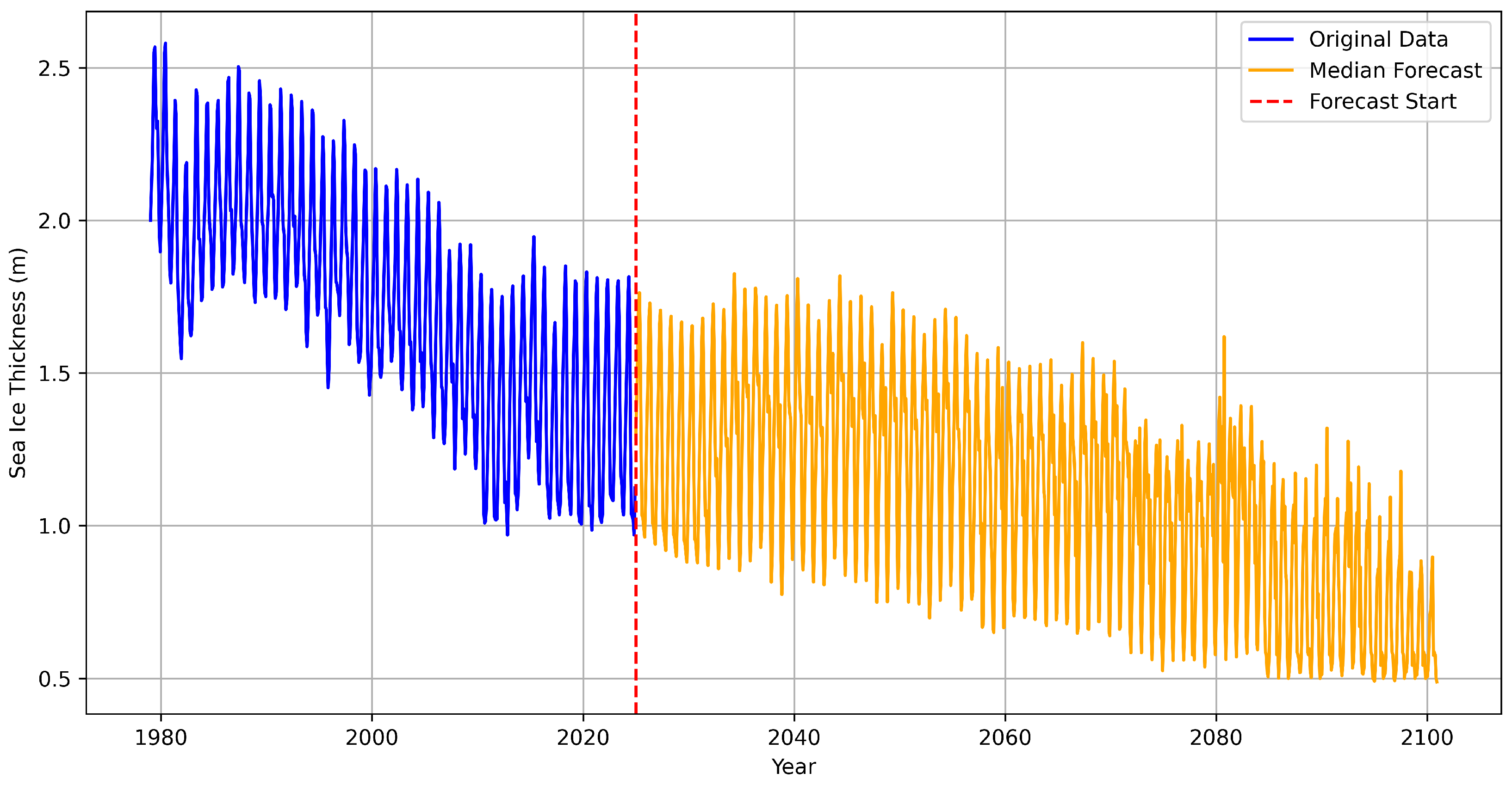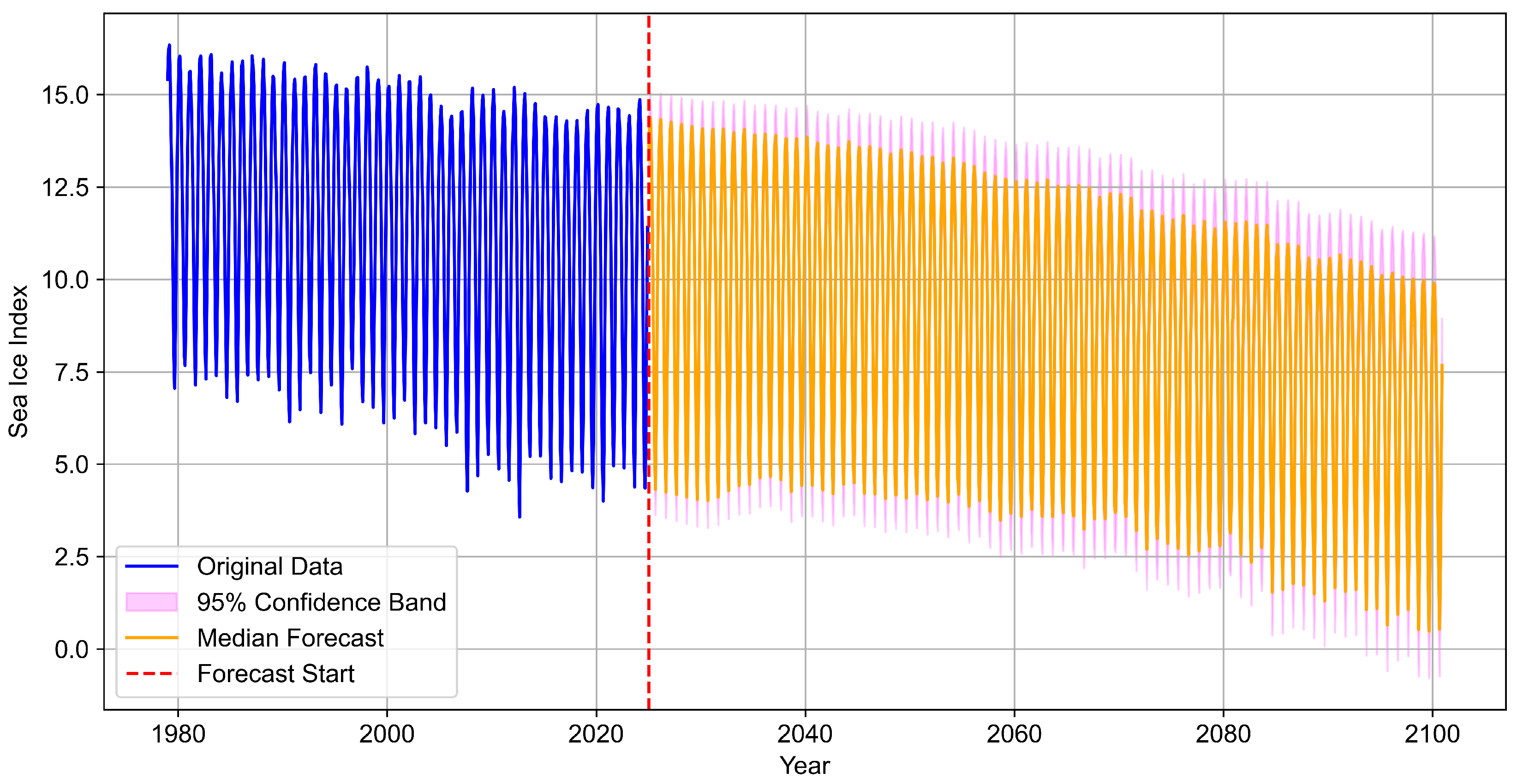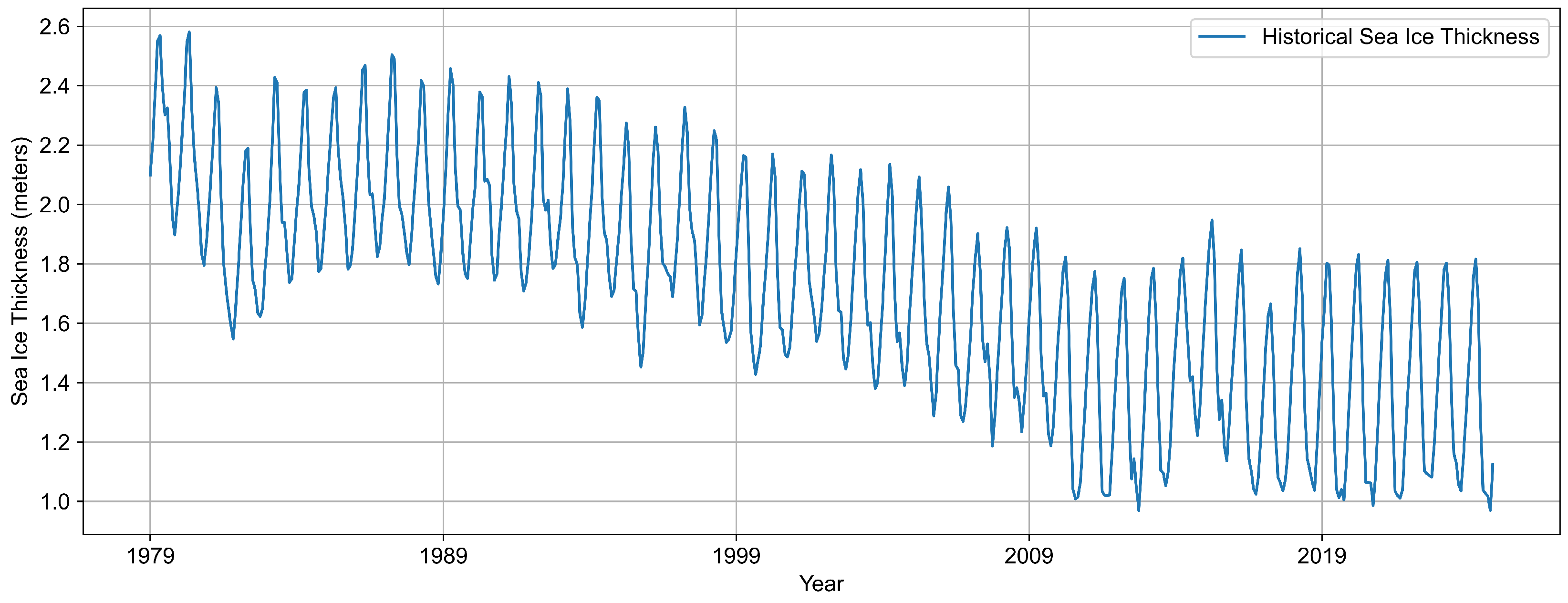 Implementation Details: Sea ice extent data was read from "ice_extent_arr.csv" with header parsing, while thickness data was read from "thickness_arr.csv’ as a headerless single-column file using "scan()" with robust NA handling for common missing value tokens ("NA","NaN","nan","","?"). Both series were converted to time series objects with monthly frequency starting January 1979 and aligned to common minimum length to prevent trailing mismatches.