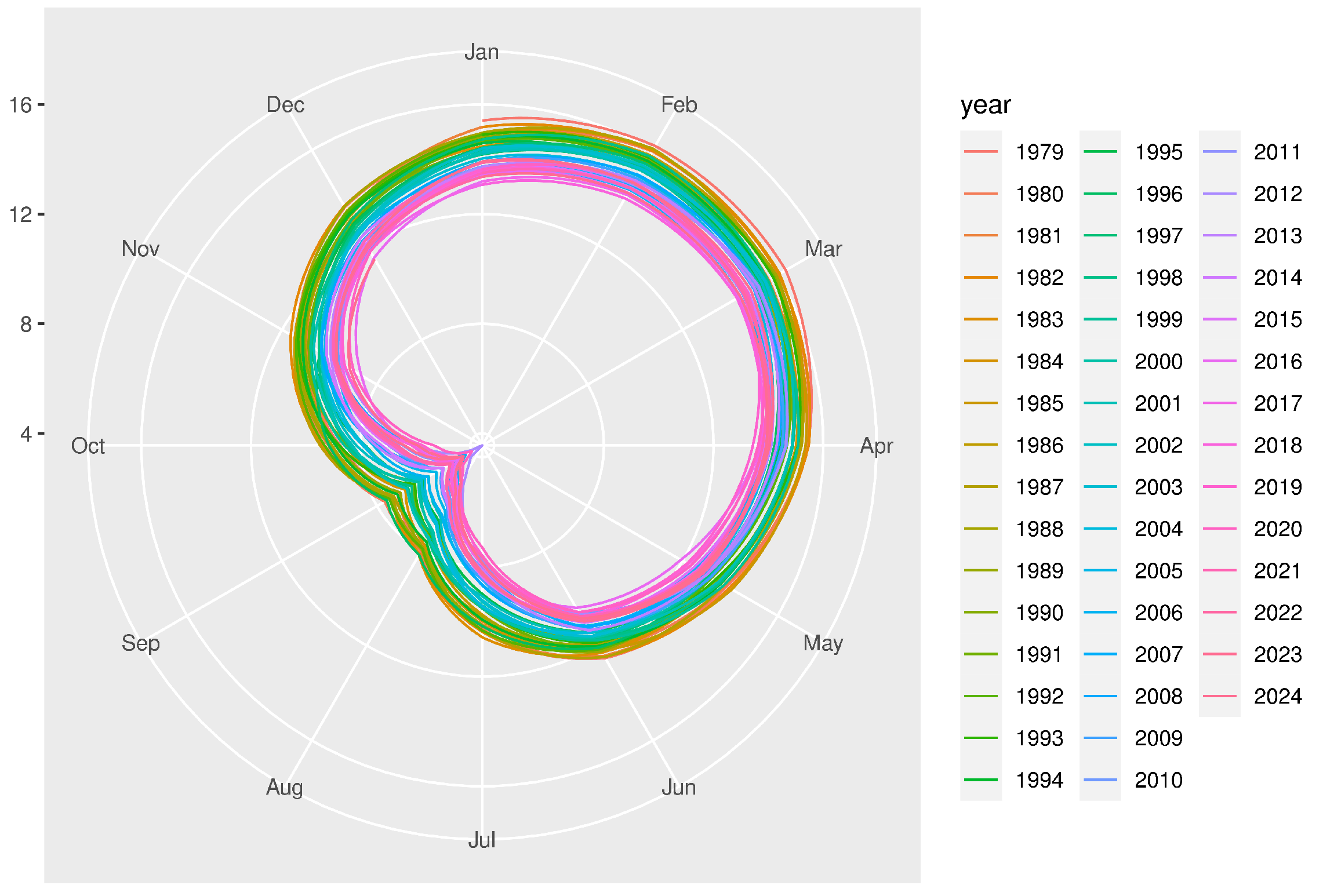 Output and Reproducibility: All results were exported to CSV format ("chow_tests_ice_extent.csv", "bai_perron_breakdate_cis.csv") and R objects saved via "saveRDS()" for full reproducibility. Diagnostic plots included time series with identified break dates, RSS profiles across break numbers, and sup-F statistics over potential break locations with 95% critical value boundaries.