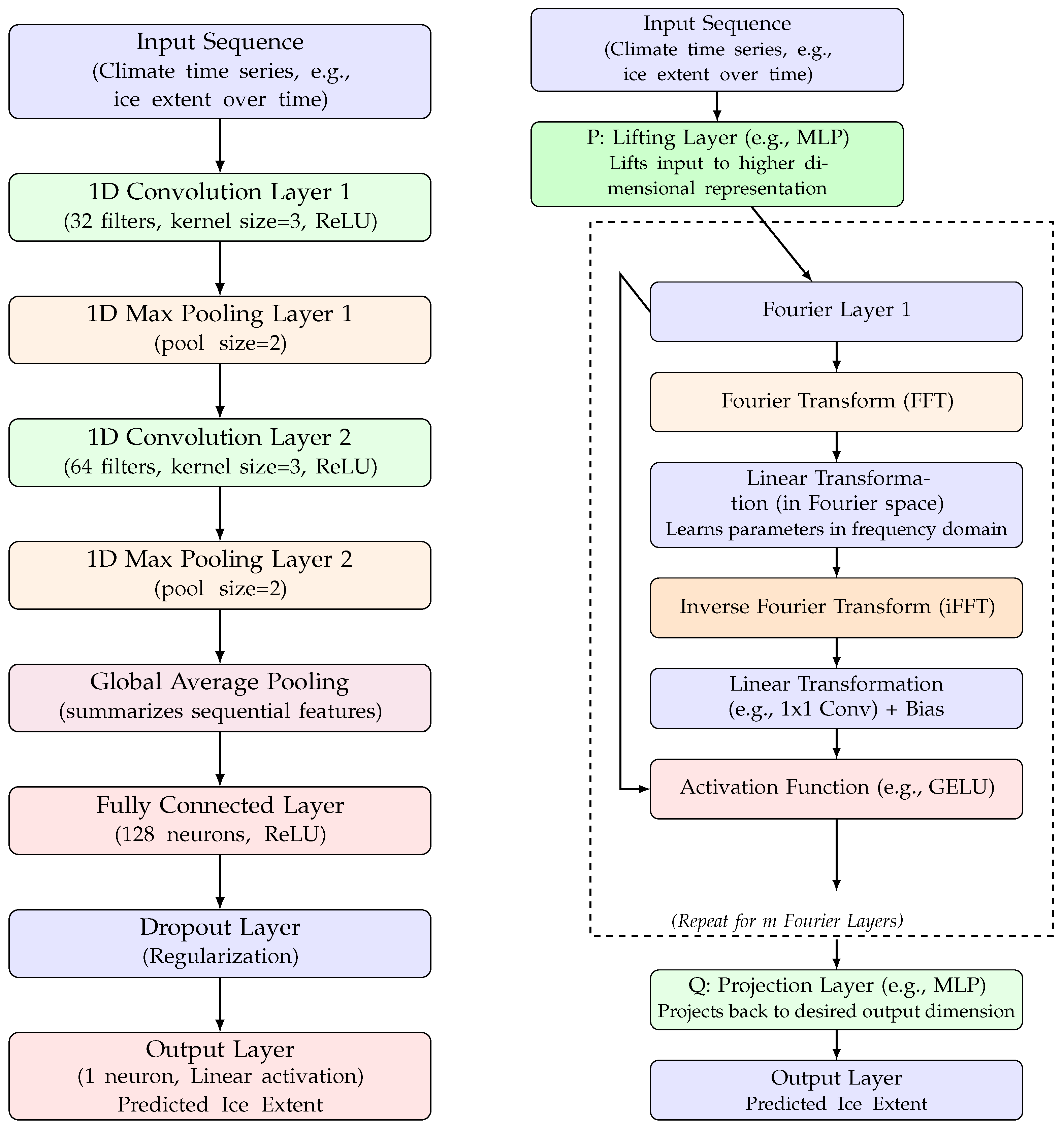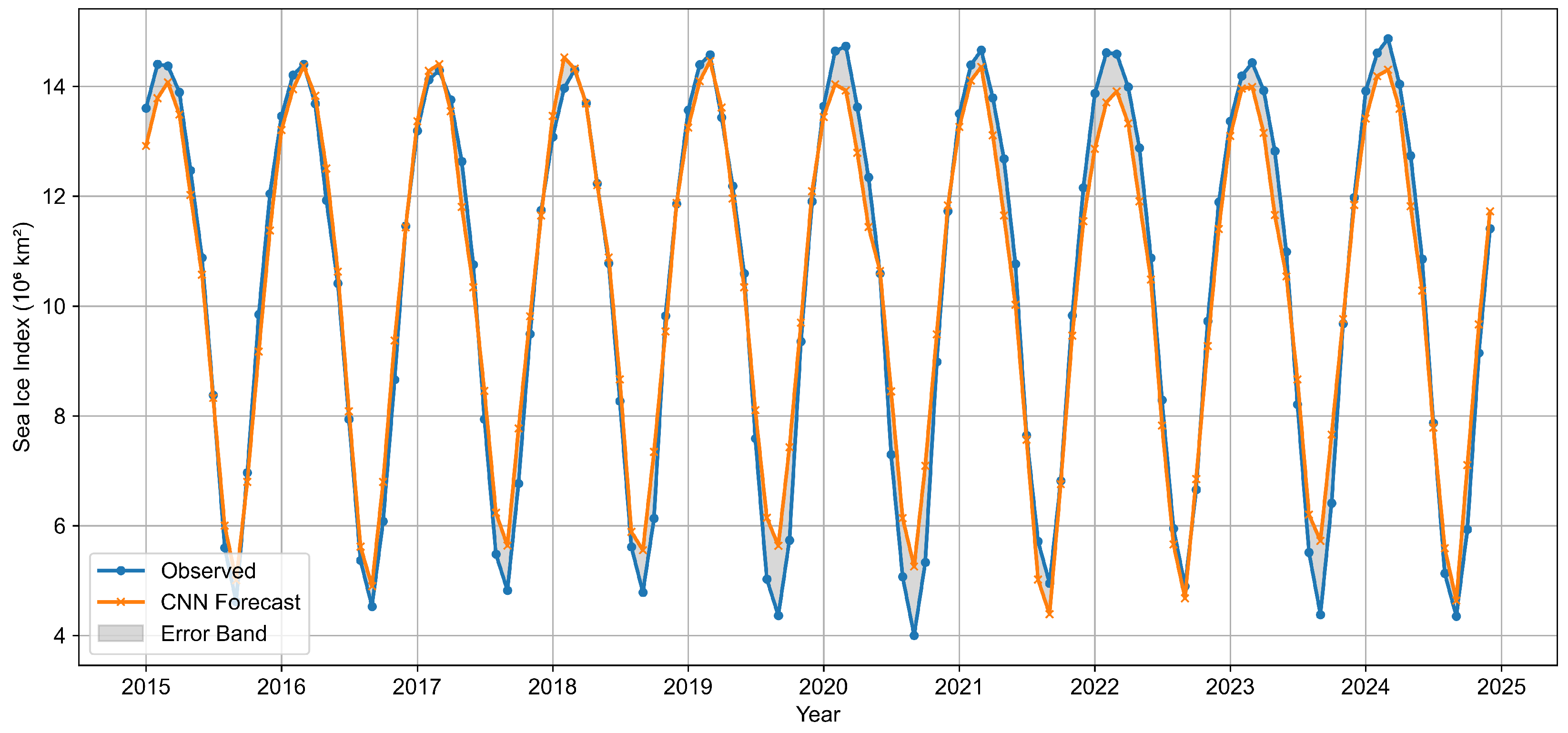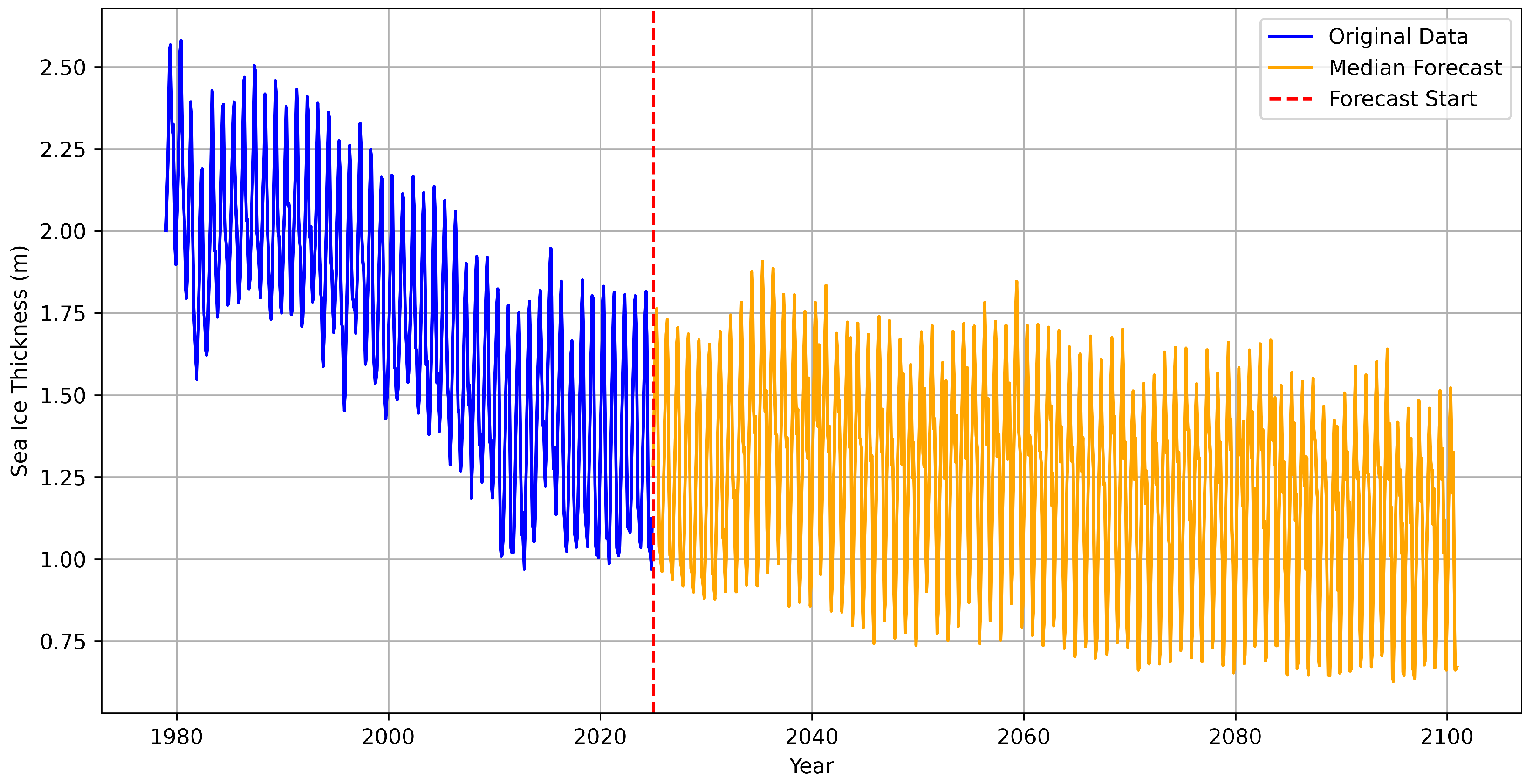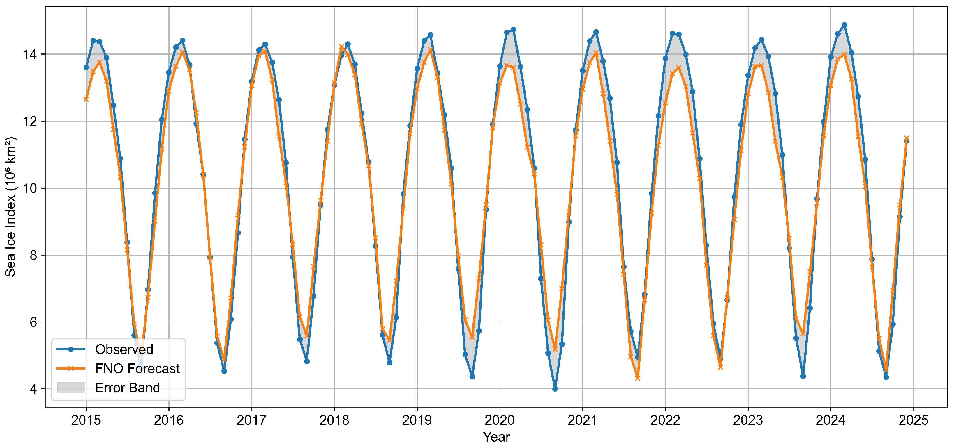 Implementation Details: The analysis employed a rigorous out-of-sample evaluation framework with models trained on 1979-2014 and evaluated strictly on 2015–2024. The statistical baseline used an ARIMAX specification selected via exhaustive search with "auto.arima()" (settings: "stepwise=FALSE", "approximation=FALSE", "ic=aicc"). All exogenous regressors were mean-centered on the training window to prevent data leakage, comprising lag-1 ice thickness (THK_L1), temperature anomaly (TMP), and their interaction (INT = THK_L1 × TMP).