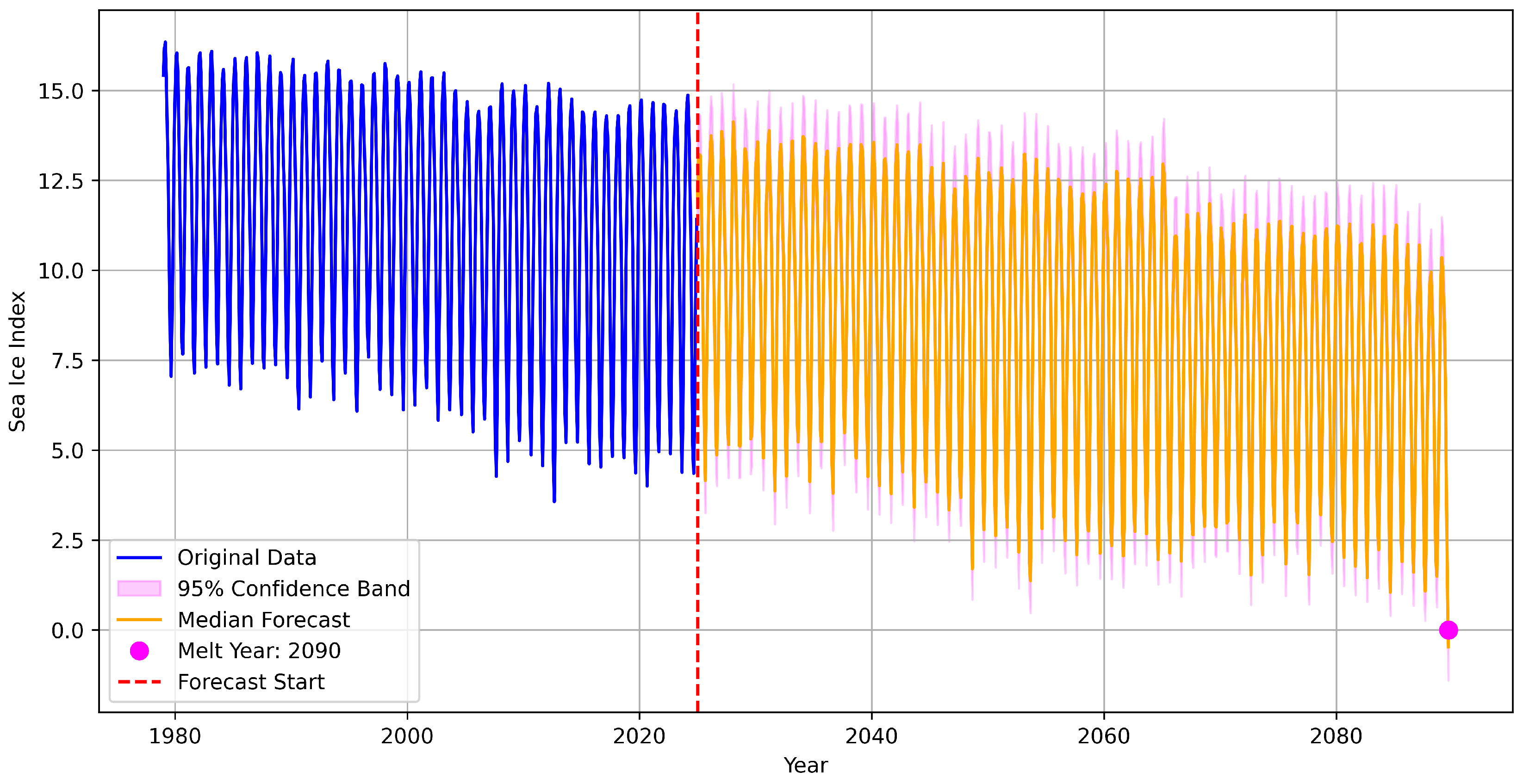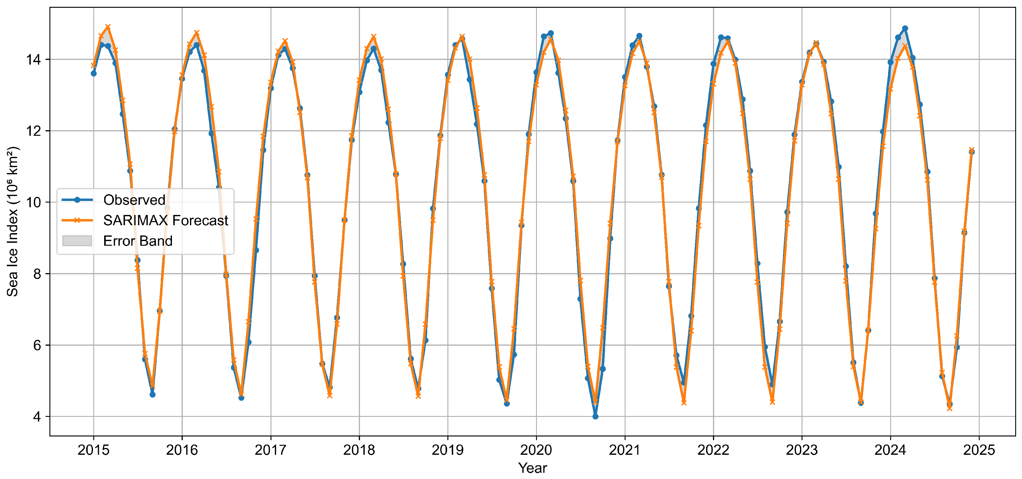 Implementation Details: The variable selection framework employed nested model comparison using comprehensive statistical diagnostics. The full SARIMAX model included five exogenous predictors: Arctic Oscillation (AO), lag-1 ice thickness, global land-sea surface temperature anomalies, ENSO, and the thickness-temperature interaction term. Both models used identical ARIMA specifications determined via "auto.arima()" with exhaustive search ("stepwise = FALSE", "approximation = FALSE") to ensure strict nesting for likelihood ratio testing.