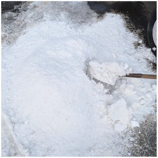 Snow sourced from CRREL site where it naturally occurred. Image shows the snow after being processed with a snowblower prior to being added to the CEB machine hopper. Snow grains ranged from approximately 2–3.5 mm prior to processing with the snowblower. After processing, snow grains were 1 mm on average.