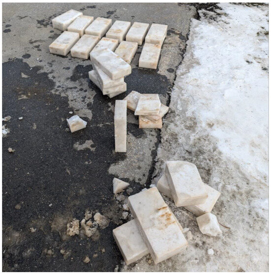 A mixture of successful (background) and unsuccessful (mid- and foreground) compressed snow blocks (CSBs) produced by the Impact 2001A machine. Unsuccessful blocks are those that failed upon being ejected from the machine (i.e., structural failures such as collapse or chipping) or were not produced at the correct block height (i.e., actual block height is half or less than half the intended block height). Successful blocks are those within 1 cm of the intended block height setting.