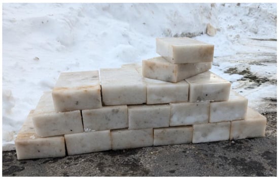 A gas-powered snowblower (Honda HS828 Snowblower, Torrance, CA, USA) was employed to mechanically break down and disaggregate the snow particles. This improved the consistency and flowability of the snow prior to compaction (i.e., the ability of the snow to easily and evenly flow off the shovel into the hopper rather than in chunks) (Figure 2) [3] (pp. 311–320). Snow grains ranged from approximately 2–3.5 mm prior to processing with the snowblower. After processing, snow grains were 1 mm on average. This process helped create a more uniform particle size and moisture distribution, enhancing its workability during subsequent handling. This processing step produced a more homogeneous snow matrix with consistent grain size and moisture distribution, establishing uniform initial conditions for subsequent sintering during compaction and curing [6,7]. Using this processed, homogeneous snow as the source material for all test blocks helped minimize variability due to natural heterogeneity in the sampled snowpack, reducing the likelihood that block-to-block strength differences resulted from local variations in snow density or bonding. Following snow processing, the material was manually shoveled into the feed hopper of the Impact 2001A, where it was compacted into blocks using the machine’s standard operation cycle at the maximum operating pressure of 20,684 kPa (per recommendation by AECT). Given that the machine was not originally designed for low-temperature operations or for compressing fine, cold particulate matter like snow, special attention was paid to machine performance, material ejection, and any mechanical sticking or jamming during pressing cycles.