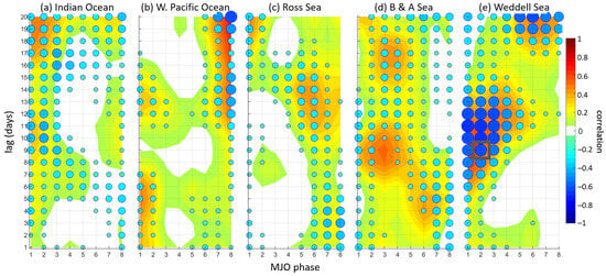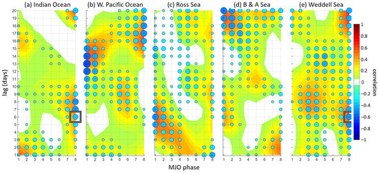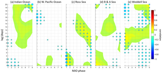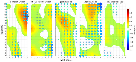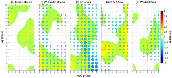 It is important to note that while the strongest correlations between anomalies in sea ice and both v-wind and SAT during the month of May occur 16 days after active MJO phase 8, these maxima in correlations do not appear instantaneously but rather build slowly from day +9, reaching their peak on day +16 and then decaying slowly to day +20 (Figure 3a). Similar, although weaker, correlations are also observed in adjacent phases (5–7). This anomaly pattern, where the signal is present over multiple time lags and in adjacent phases, is typical of the quasi-cyclic modulation of the extratropics by the MJO [34,89]. Finally, it is important to note that in May, sea ice anomalies in other sectors are moderately correlated with anomalies of one, but not both, of the two surface variables (e.g., with v-wind but not temperature). For example, in the Western Pacific Ocean sector, 10–12 days after active MJO phases 1 and 2, ∆SIC is moderately correlated with meridional wind (correlation coefficients as high as +0.50; p < 0.001) but only weakly correlated with SAT (correlation coefficients around −0.10; p = 0.025) (Figure 3b). Similarly, 8–12 days after an active MJO phase 8, ∆SIC in the B&A Seas is moderately correlated with SAT (−0.40; p < 0.001) but not with v-wind (r near zero) (Figure 3d). Other regional agreement between SIC and the v-wind (but not SAT) is seen in the western Ross Sea 13–15 days after active MJO phases 3–5 (Figure 3c).