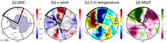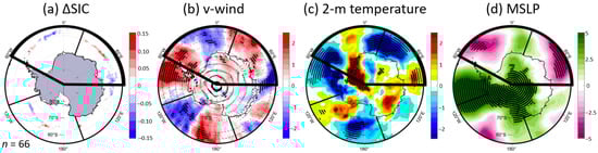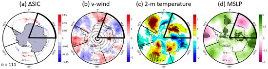 Third, the relationship between the atmospheric environment and Antarctic sea ice was examined via daily anomalies of the 10 m meridional wind component (v-wind), 2 m surface air temperature (SAT), and mean sea-level pressure (MSLP) from the ERA5 reanalysis [84] from 1989 to 2019. Daily anomalies of the v-wind, SAT, and MSLP at grid spacing of 0.25° × 0.25° at 0000 UTC were calculated using the method described above for sea ice, and those anomalies were then binned by phase at 0–20-day time lags after an active MJO. The anomalies were tested for statistical significance using a Welch’s t-test similar to the ΔSIC anomalies. The strength of the agreement between the anomalies of v-wind, SAT, and ∆SIC by MJO phase, sector, and time lag was quantified in Pearson product-moment correlation coefficients. Correlation coefficients (r) were calculated between ∆SIC and v-wind and SAT anomalies at every grid point in each sector for each MJO phase and month after projecting the v-wind and SAT reanalysis data from the ERA5 grid onto the ∆SIC grid. The correlations were used to determine in which phase, sector, and time lag the MJO modulation was strongest. In this study, we define correlation strength as follows: strong |r| > 0.6, moderate 0.3 > |r| > 0.6, and weak |r| < 0.3, following [85]. It is important to note that due to the large number of paired gridded observations (n > 500) used to calculate the correlations in each sector, correlation coefficients larger than 0.146 are statistically significant beyond 99.9% (p < 0.001).