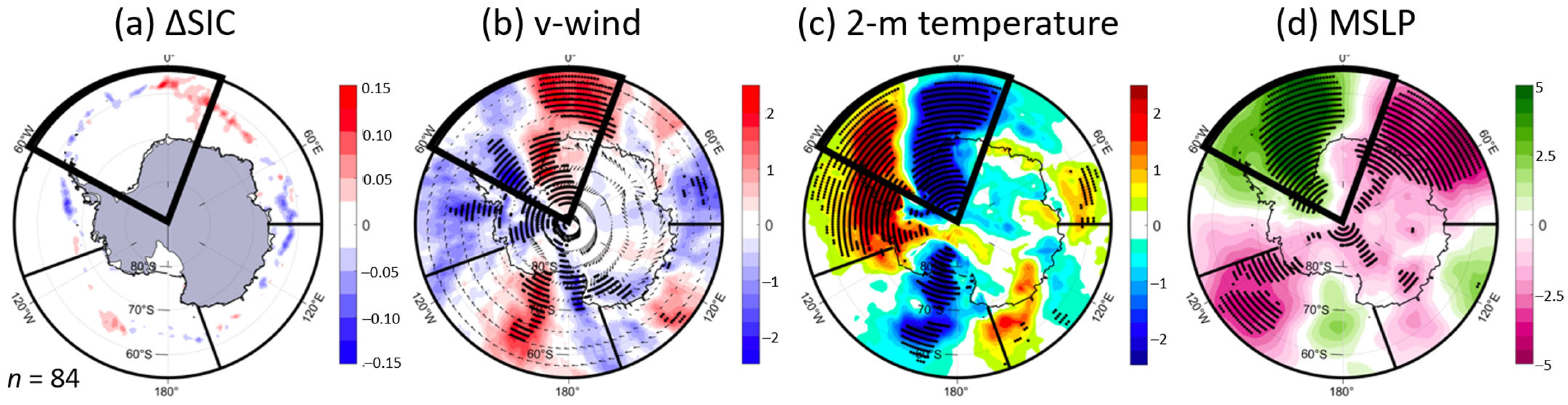 - Raphael, M.N. The Influence of Atmospheric Zonal Wave Three on Antarctic Sea Ice Variability. J. Geophys. Res. Atmos. 2007, 112, D12112. [Google Scholar] [CrossRef]
