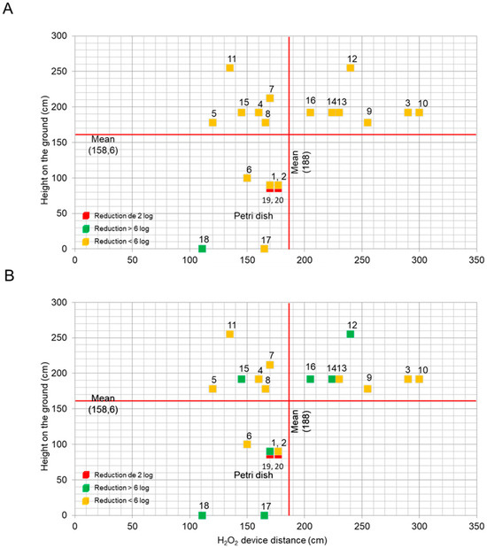 The chemical indicators, positioned at various locations, provided results presented in logarithmic reduction, ranging from 2 log to over 6 log (Figure 2). The cards were arranged according to their height from the ground, their distance from the devices, and logarithmic reduction, utilizing a color code. Based on the results of two out of three trials, the reference colors were defined as follows: green indicated a reduction of more than 6 log, yellow indicated a reduction of less than 6 log, and red indicated a reduction of less than 2 log.