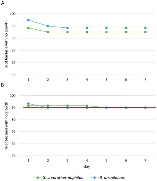 Survival analysis of G. stearothermophilus and B. atrophaeus exposed to (A) aHP and (B) HPV during 7 days of incubation. Red line represents the average efficiency of DCs. Each trial was performed three times.