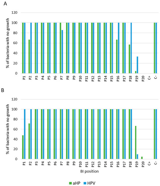 Figure 4 displays the percentage of biocidal efficacy of the aHP and HPV systems according to the BIs’ positions. The results highlight a divergence between the two systems, particularly at positions 1, 2, 7, 16, 18, 19, and 20. For G. stearothermophilus (Figure 4A), HPV demonstrated 100% efficacy at positions 2, 16, and 18, while aHP showed efficacies of 67% and 57%, respectively. The only position where aHP exhibited higher efficacy was position 7, with 100% efficacy, compared with 86% for HPV. For positions 19 and 20 (coupons placed in the Petri dish), HPV demonstrated better diffusion compared with aHP, with efficacies of 33% and 5%, respectively, for position 19. As for position 20, there was no difference for both DCs.
