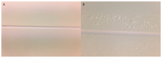 Photographs of a partition junction before (A) and after (B) an HPV test. (A) Partition with a smooth coating (RH < 100%); (B) partition with a blistered coating (RH > 100%).