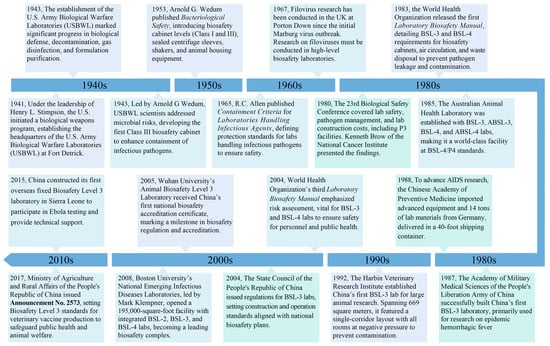 In response to these public health challenges, the Academy of Military Medical Sciences of the People’s Liberation Army of China, successfully built China’s first BSL-3 laboratory, primarily used for research on epidemic hemorrhagic fever caused by hantaviruses in 1987 [28]. The laboratory was equipped with non-standard exhaust filtration systems, autoclaves, pass-through windows, wastewater treatment facilities, and observation areas, and it established detailed operating procedures. This BSL-3 lab significantly advanced China’s research on hemorrhagic fever and provided valuable experience for the construction and management of higher-level biosafety laboratories in the country.