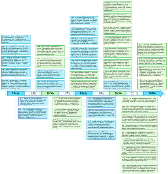The establishment of high-containment laboratories such as Australia’s Australian Animal Health Laboratory (AAHL) in 1985 reflected a growing emphasis on managing zoonotic diseases and global health security. This facility, equipped with BSL-3, ABSL-3, BSL-4, and ABSL-4 laboratories, represented a significant advancement in biosafety infrastructure [26]. This facility made AAHL one of the world’s highest-standard animal health laboratories, reaching BSL-4/P4 levels. AAHL was designed specifically to study pathogens that pose extreme danger to animals and potential threats to human health. Its establishment significantly enhanced Australia’s ability to research and respond to animal diseases, especially those with zoonotic potential, such as rabies and foot-and-mouth disease. The facility included advanced isolation and containment technologies to ensure absolute biosafety within and outside the laboratory. Through its state-of-the-art biosafety facilities and stringent management systems, AAHL provides vital support for global research and control of high-risk pathogens [27].