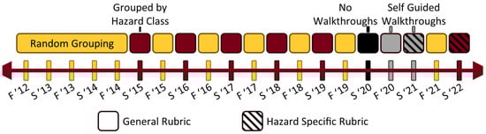 Lab safety walkthroughs are conducted by LSOs in groups of 3–4 labs once a semester with every research group participating, even computational groups in recent years. The A&C committee is responsible for revising walkthrough rubrics, organizing walkthrough groups, setting deadlines, and handling submitted rubrics. As shown in Figure 1, several strategies have been used to group walkthrough participants. From the Fall 2012 semester (Fall 2012) to Fall 2014, LSOs were grouped randomly, without considering experiences with particular hazards. In the Spring 2015 semester (Spring 2015), research groups were designated with a hazard classification based on the research being undertaken. Then, from Spring 2015 to Fall 2019, walkthrough groups were organized by shared hazard class in the spring and by intermixed hazard classes in the fall. The pattern was interrupted by COVID-19 in Spring 2020, when no walkthroughs were organized, and subsequent social distancing required self-guided walkthroughs in Fall 2020 and Spring 2021. Then, from Fall 2020 to the present, the grouping has been reversed, with groups organized by hazard class in the fall and by intermixed hazard classes in the spring. Since its creation in Fall 2020, hazard class-specific rubrics have been used in all walkthroughs organized by hazard class. General walkthrough rubrics were used prior to Fall 2020 and continue to be used for walkthroughs organized by intermixed hazard classes.