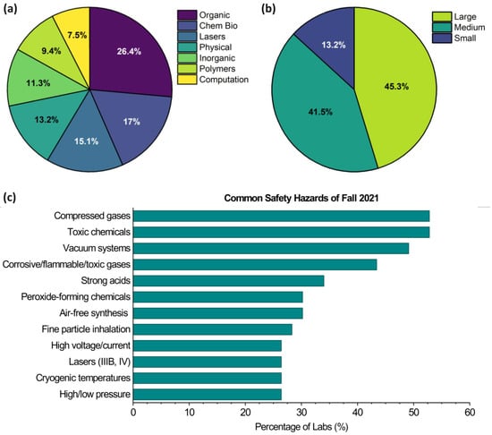 Survey responses of participating labs in the CHEM and CEMS departments in Fall 2021 (n = 53), identifying (a) primary hazard classes, (b) lab sizes, and (c) the most common safety hazards (>25%) for all labs. For lab sizes, large is ≥16 researchers, medium is 8–15 researchers, and small is ≤7 researchers.