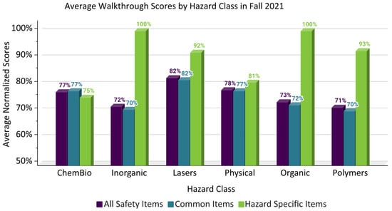 The first in-person hazard-specific walkthroughs took place during the Fall 2021 semester. The rubric safety items were categorized as common and hazard-specific. The common items make up our general walkthrough rubric and were found in all rubrics, with a few exceptions. The hazard-specific items were designed based on unique safety considerations for that hazard class and differentiated the rubrics, despite some of these items being shared between 2–3 hazard classes. The normalized scores for each hazard class were determined considering all safety items, common safety items, and hazard-specific safety items to explore the effect of hazard-specific items on the total normalized scores between hazard classes. The average score of the hazard-specific items for each hazard class was also considered since the maximum score of hazard-specific items is 3 or 5, and hence they are normalized to different totals.