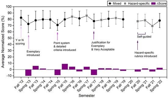 The first walkthrough, Fall 2012, simply had a “Yes” or “No” rating for whether items are acceptable or not. From Spring 2013 to Spring 2015, groups evaluated one another based on scores of “Needs Attention”, “Acceptable”, and “Exemplary”. The first point system, introduced in Spring 2015, assigned scores of (−1, 0, 1) to “Needs Attention”, “Acceptable”, and “Exemplary” items, respectively, but was changed in Fall 2016 to the 1–5-point system that is currently used and discussed above. To compare these data sets, we assigned each rating to its corresponding score (1 = “Needs Attention”, 3 = “Acceptable”, 5 = “Exemplary”), including Spring 2015. Scores for each participating lab were summed and normalized to the maximum score for that rubric. Normalization is necessary to accommodate any adaptations to the scoring of safety items over time and to accommodate situations where safety items were left unscored. Items that are not applicable to a lab receive an “Acceptable” score of 3. Additionally, the introduction of hazard-specific rubrics in Fall 2020 introduced and adapted safety items, changing the maximum scores from one hazard class to another. From the normalized scores, the average and standard deviation among all participating labs for each semester were calculated.