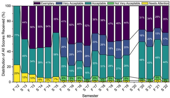 One interesting semester is Fall 2020, where, despite still seeing more “Needs Attention” scores than Spring 2021, it has significantly lower scores than the other recent fall semesters. This can be seen more clearly by looking at the safety items that consistently have the greatest number of “Needs Attention” scores over the 10 years of data (Figure A2). In Fall 2020, they all dropped significantly and subsequently increased the following semester. There are several possible explanations for this result. As explored earlier, the walkthroughs in Fall 2020 and Spring 2021 were self-guided due to COVID-19 safety concerns, whereas, in Fall 2021, the JST returned to the traditional peer evaluation walkthroughs. We suggest that self-guided researchers were more likely to give themselves fewer “Needs Attention” scores when assessing their own labs as compared to their peers. Despite overall normalized walkthrough scores remaining fairly constant (Figure 4), we observe that more LSOs gave themselves acceptable scores (3–4) rather than a “Needs Attention” or “Exemplary” score (Figure 5) in Fall 2020. With peer walkthroughs resuming in Fall 2021, LSOs that perhaps became accustomed to safety concerns in their lab, in turn, receive “Needs Attention” scores for those corresponding items. In the same vein, becoming accustomed to safety concerns with time can also occur over the summer. This complacency to hazards is a common safety concern that can effectively be mitigated through proper initiatives that include lab walkthroughs and audits [25,26]. To reiterate a past explanation, the decrease in “Needs Attention” scores in Fall 2020 could be the result of fewer researchers working in the lab due to implications of the COVID-19 pandemic and therefore fewer safety concerns. It is challenging to suggest a single explanation, as greater safety awareness, less usage of the lab, and less strict adherence to our detailed scoring criteria may have all played a role in the dip in “Needs Attention” scoring during the pandemic.
