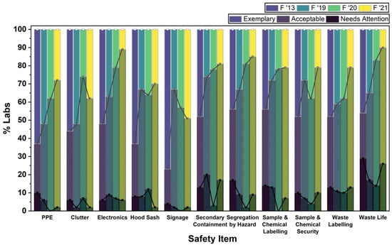 To explore changes since JST inception and around the pandemic, the percentages of “Needs Attention”, “Acceptable”, and “Exemplary” scores for individual safety items across four Fall semesters, 2013, 2019, 2020, and 2021, are shown in Figure 6. The analysis was isolated to only fall semesters to remove any seasonal influence, like summers off. Further, fall semesters are highlighted here because the first self-guided walkthrough and reintroduction of peer evaluation walkthroughs took place in Fall 2020 and 2021, respectively. It is important to note that the latter two semesters used hazard-specific groupings, but as shown earlier, that effect is minimal. Fall 2013 used the three-category scoring system and was hence chosen as the first semester to highlight. The next semester selected, Fall 2019, tracks changes over a 6-year period prior to the pandemic. Eyewash and chemical transport are safety items excluded from this analysis due to their absence in Fall 2013 walkthrough, and food/drink are excluded for having variable scoring of (1,3) or (1,5) across the semesters. For simplicity, “Needs Attention” scores include “Not Very Acceptable” scores, and “Acceptable” includes “Very Acceptable” scores. The same approach is taken for spring semesters shown in Figure A1.