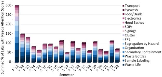 The summed percentage “Needs Attention” scores received by labs for common walkthrough safety items from Fall 2012 through Spring 2022.