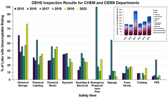 DEHS inspection data for various safety items in the CEMS and CHEM departments. The main bar plot shows the percentage of labs that received an “Unacceptable” rating from 2015 to 2022, broken up by safety item. The inset figure shows the summed percentage of “Unacceptable” scores for all safety items for overall comparisons from year to year. Inspections were not conducted in 2020 and 2021.