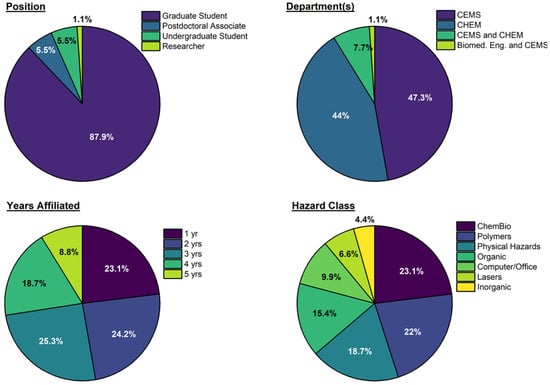 Departmental safety surveys are distributed biannually to all graduate students, postdoctoral associates, faculty, and staff within the CEMS and CHEM departments. In 2020 a separate survey for faculty and staff was developed and focused on research and teaching assistant training and discussions around safety. For the analysis here, we will focus on the researcher safety survey (undergraduates, graduate students, postdoctoral associates, and researchers) more focused on gauging safety attitudes. The demographics of the Fall 2021 safety survey are shown in Figure 9. Fall 2021 is highlighted based on the high response rate, as compared to recent years, in order to better reflect the current demographics of our research labs. Most respondents in Fall 2021 were graduate students. This is no surprise, as they are the most active group in research labs in the department and have the most exposure to the JST’s activities (e.g., LSO meetings, walkthroughs). There is an even split of respondents between the two main departments: CEMS and CHEM. There is a nearly even distribution of respondents with 1, 2, and 3 years in their department(s), making up about three quarters of the respondents. Interestingly, respondents having 5 years in their department make up the lowest percentage of all respondents. We aim to increase this percentage, as these researchers have the most experience in their respective labs and departments. The survey also prompts respondents to choose the hazard class that most suits their research activities. The hazard classes with the most respondents were ChemBio, Polymers, and Physical Hazards. These results differ from the walkthrough demographics in Figure 2 in that Organic and Lasers both have less representation.