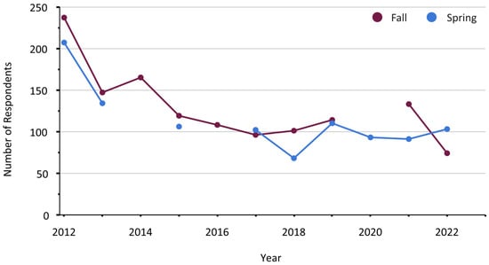 Number of total survey respondents over time for the fall (purple) and spring (blue) department safety surveys. Missing data points represent semesters where surveys were not distributed.