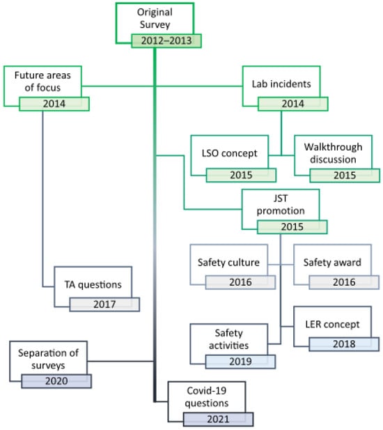 Branch diagram detailing the evolution of the JST departmental safety surveys through the past decade. Branched segments are sections introduced to the safety survey in addition to the contents of the original survey (2012–2013).