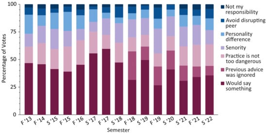 One of the longest-running questions asks if people, or researchers starting in 2019, would speak up after observing an unsafe practice and was used to understand how safety sentiments within the two departments have changed over time. Since participants could select multiple responses for why they would not speak up in addition to indicating that they would speak up, each survey response was given one vote that was split equally between the responses selected, and the partial votes were summed into a percentage by response option. The responses indicating that they have or would say something were grouped and compared to the all-time average to understand the change in safety sentiments by semester.