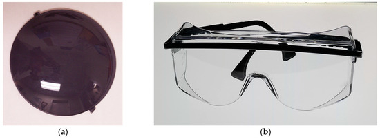 Polycarbonate is a rigid polymer with excellent optical properties [7]. It is used in the manufacture of protective glasses, goggles, shields and bullet-proof windows. When it shatters, the pieces do not contain sharp edges. Therefore, it is safer than glass. Injection-molded bowl-shaped polycarbonate lenses, such as those shown in Figure 1a, are used to make safety glasses or goggles for motorcycle riders or skiers and glasses in general. Such protective glasses and goggles are designed to provide at least some protection against small flying objects. In the course of manufacture, each bowl-shaped piece is cut to provide a pair of lenses. Alternatively, a pair of laboratory safety glasses is made by injection molding polycarbonate into a suitable mold (Figure 1b).