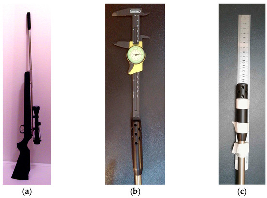 (a) The air rifle used in this exercise. (b) Air suppressor extending 5.0 cm past the end of the barrel. (c) A ruler was taped to the rifle barrel so that it could be placed at a measured distance from the target. The optimal distance was 20 cm.