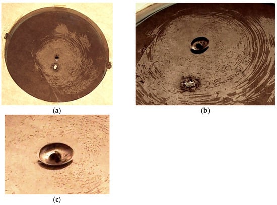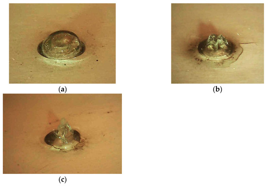 Next, the students were given sheets of polycarbonate that sustained impacts of air gun pellets (Figure 8). Initially, they had difficulties distinguishing between a penetrating impact and an impact that only dented the polycarbonate plate without penetrating it. Turning the sheet over and examining it from the other side helped students both identify impacts that passed through the sheet and explain the process (Figure 12). The impact that dented but did not penetrate the plate left a semispherical dome which was smooth to the touch (Figure 12a), while impacts of pellets that penetrate the plate left jagged back surfaces that were sharp to the touch (Figure 12b,c). The appearance of a frozen liquid was obvious. This may be an opportunity to discuss properties of polymers with the simplest explanation being that the projectile “melted through” the polycarbonate sheet.