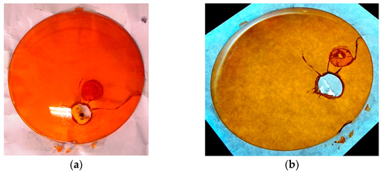 (a) Impact of a hollow-point 22 LR round. (b) The same lens is shown backlit.