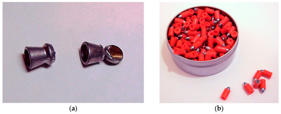 Pellets of various sizes, shapes and weights were examined as an alternative to the use of a firearm. A standard 0.177” air gun pellet has a weight of 7.9 gr (grains) or 0.51 g. Lighter and heavier specialty pellets are available. The reduced-weight pellets needed for this exercise were hand-made by using an Exacto knife to cut off a part of a standard pellet (Figure 6a). The pellet was cut at the “neck” where the “skirt” met the pellet “head.” The resulting “skirt” was used. They were weighed, and initially only those weighing 0.30–0.31 g were used. However, after all the pellets prepared in this manner were tested, there was no difference in their penetrating power, and all of them were used. They weighed in the range of 0.24–0.35 g. Alternatively, a commercially available Crosman lead-free 5.4 gr (0.35 g) pellets were used (Figure 6b) [16].