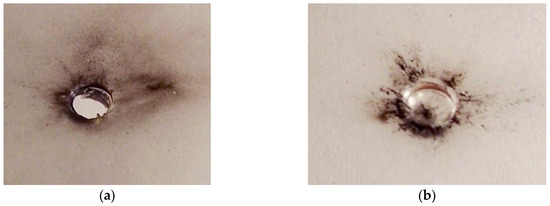 Air gun pellets were fired at a polycarbonate target from various distances ranging from 5 to 30 cm. Due to the presence of the air suppressor, the barrel could not be placed any closer than 5.0 cm from the target. Projectiles from the break barrel air rifle initially had unexpectedly high power and penetrated the polycarbonate from a distance of 5 cm, leaving a clean hole. From distances of 10–30 cm, they melted through without leaving a hole (crater-effect) (Figure 7). However, soon the power diminished, and the pellets dented but did not penetrate the polycarbonate plate even when fired from a distance of 5.0 cm.