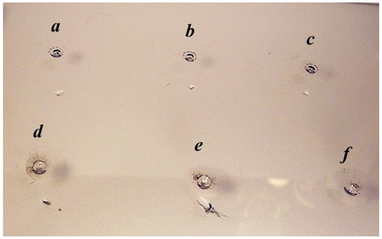 Impacts of projectiles fired from a break0barrel air rifle into a polycarbonate plate: (a–c) Crosman low-weight pellets penetrated polycarbonate and caused minor damage on the paper underneath. (d,e) Hand-made low-weight pellets penetrated polycarbonate plate and caused more extensive damage. Note the burn marks, which are indication of dieseling. (f) Regular-weight lead pellets only dented, but did not penetrate, the polycarbonate plate. Pellets (a–c) were fired from the distance of 20 cm and showed no burn marks even though there was dieseling involved. Pellets (d–f) were fired from the distance of 5 cm and that is close enough to show burn marks if dieseling is present.