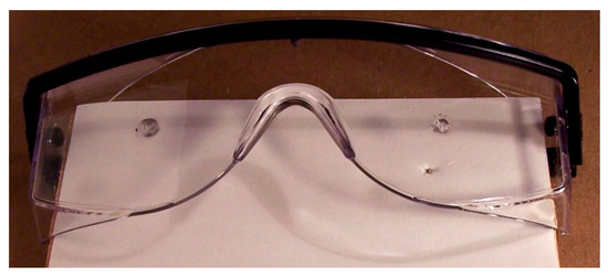 The impact-protective ability of safety glasses and facial shields was tested by firing a projectile from a break-barrel air rifle in the same manner as that described in the previous section. A ruler taped to the rifle barrel served as a spacer, and pellets were fired from the distance of 20 cm. Polycarbonate glasses provided excellent protection and, while in some instances the surface was dented, various pellets did not penetrate the googles. Reduced-weight hand-made lead pellets easily penetrated polycarbonate sheet when fired from a distance of 5 cm (Figure 8). However, they did not penetrate safety glasses when fired from a distance of 20 cm (Figure 9). The only projectile to penetrate safety glasses from the distance of 20 cm was a Crosman lead-free 5.4 gr pellet, which is made of a harder material [16].
