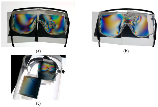 (a) A single impact shows a high strain around the impact site on the right. The left lens shows only smooth color change and, therefore, low strain. (b) Two sequential impacts that cracked the glasses show more extensive strain. (c) Impact of a pellet from an air gun on a facial shield shows only the strain at the impact site, while the rest of the shield appears to be strain-free.