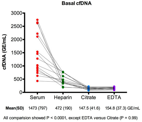 Basal cfDNA levels in genomic equivalents per mL (GE/mL) in serum, heparin-plasma, citrate-plasma, and EDTA-plasma samples, measured 15 min after blood draw. The cfDNA yield [mean (SD)] was highest in serum, followed by heparin-plasma, citrate-plasma, and EDTA-plasma (n = 15). Statistical analysis revealed that all comparisons were highly significant (p < 0.0001), except for the comparison between EDTA-plasma and citrate-plasma (p = 0.99).