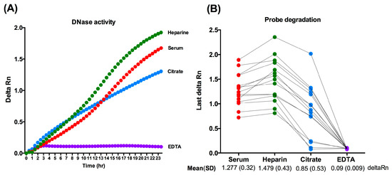 In contrast, the kinetics of probe degradation in citrate-plasma differed from those in serum and heparin-plasma, suggesting a partial inhibitory effect on DNase activity. On the other hand, in EDTA-plasma, the probe degradation plateaued at the beginning of the reaction, with no further increase observed, confirming an extensive inhibitory effect of EDTA on blood DNase activity (a representative depiction of endogenous DNase activity in a paired set of tested plasmas and serum can be found in Figure 2A).
