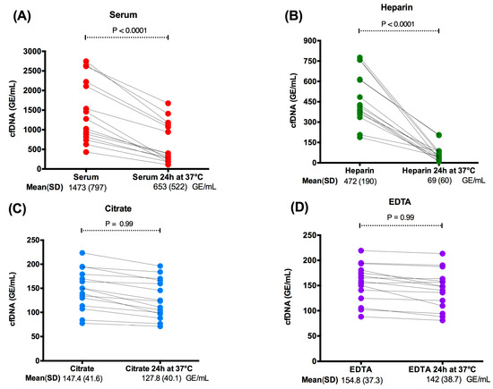 Next, to observe the effect of blood DNase activity on cfDNA ex vivo, we measured the degradation of cfDNA by quantifying its levels after incubation at 37 °C for 24 h. In serum, cfDNA levels decreased by a mean of 55.6% [from 1473 ± 797 GE/mL to 653 ± 522 GE/mL, p < 0.0001] (Figure 3A). Heparin-plasma showed a mean reduction of 85.3% [from 472 ± 190 GE/mL to 69 ± 60 GE/mL, p < 0.0001] (Figure 3B). Conversely, in citrate-plasma, cfDNA levels declined by 13.3% [from 147.4 ± 41.6 GE/mL to 127.8 ± 40.1 GE/mL, p = 0.99] (Figure 3C), and in EDTA-plasma, there was an 8.0% reduction [from 154.8 ± 37.3 GE/mL to 142.4 ± 38.7 GE/mL, p > 0.99] (Figure 3D).