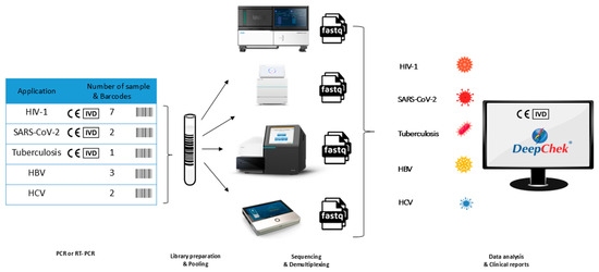 We collected 15 samples that were assessed as HIV-1, HCV, HBV, SC2 and TB positive by Quality Control for Molecular Diagnostics (QCMD), with viral loads varying from sample to sample. Plasma RNA or DNA load ranged from 13,346 to over one million copies/mL in 13 QCMD and was unavailable in the remaining 2 QCMD. For the study, 7 HIV-1, 3 HBV, 2 HCV, 2 SC2 and 1 TB were selected. The targets, viral loads and DNA concentration of each sample are summarized in Table 1 and the workflow is described in Figure 1.