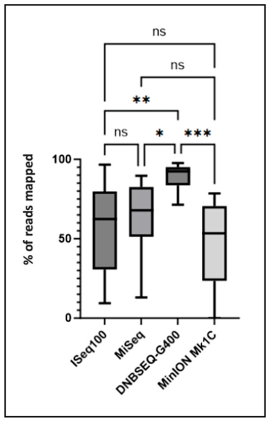 Pathogen-mapped sequences (in %) obtained after sequencing on the four platforms. The number of sequences mapping to the pathogen of interest was compared between the different platforms. Significant differences determined using one-way analysis of variance (ANOVA) and Tukey’s multiple comparison test as post hoc analysis are indicated by asterisks (* p ≤ 0.05, ** p ≤ 0.01, *** p ≤ 0.001, ns p > 0.05). A Bartlett correction is performed for multiple comparisons.